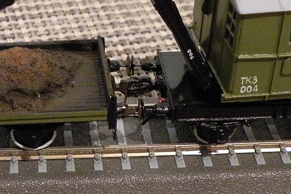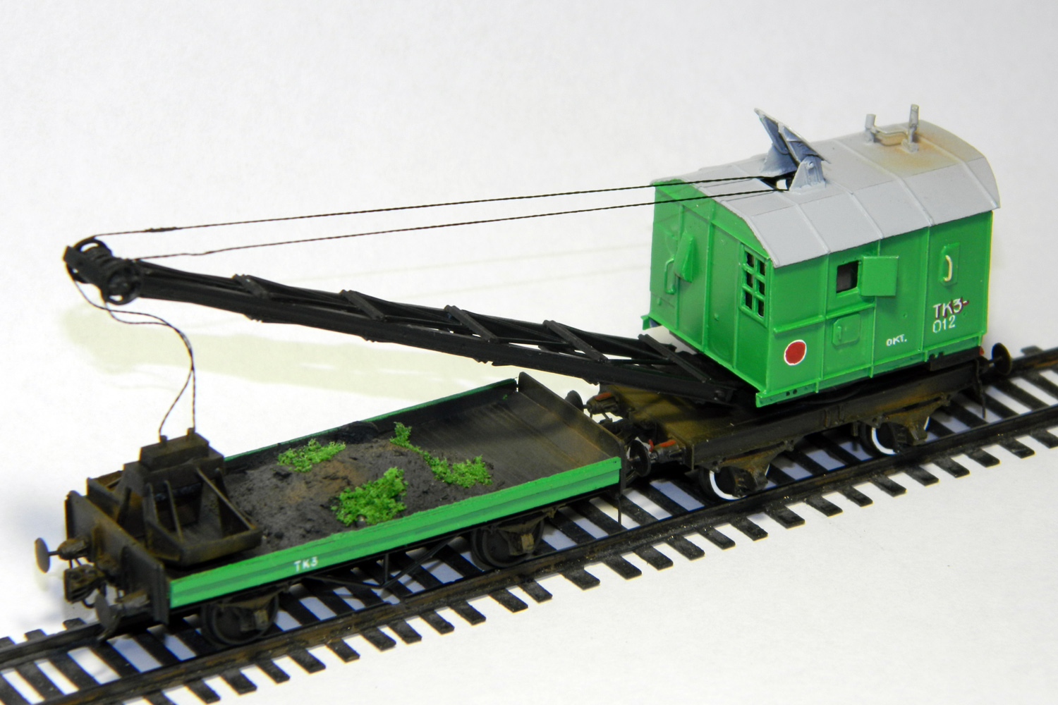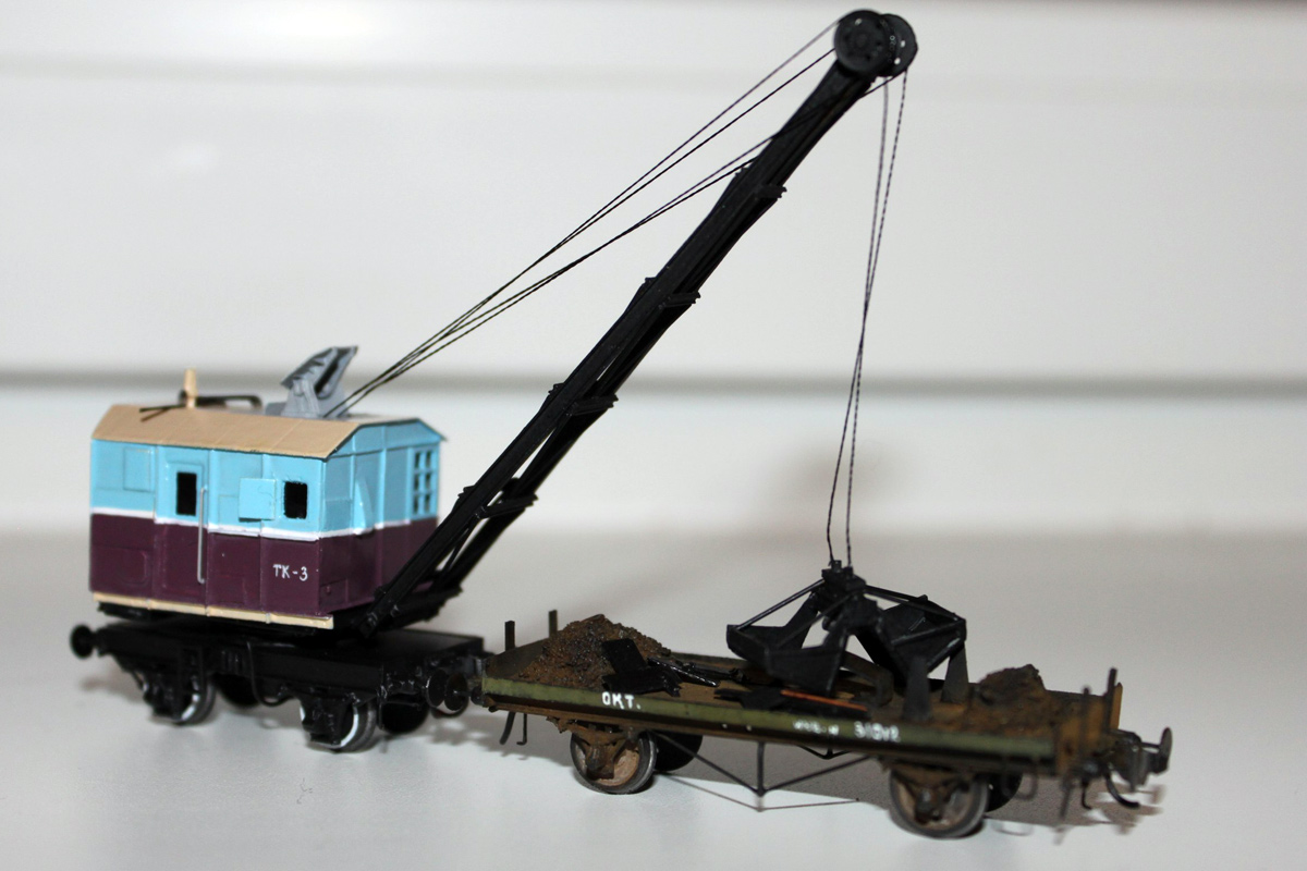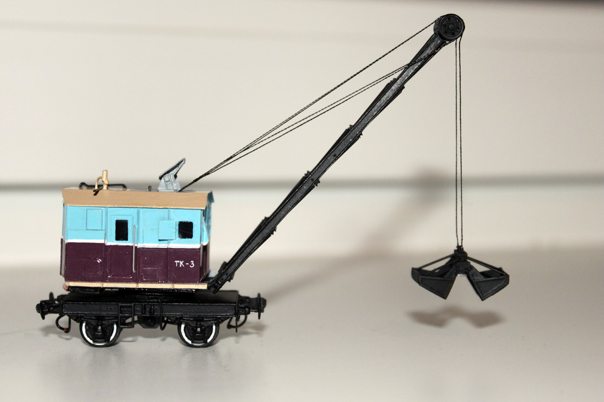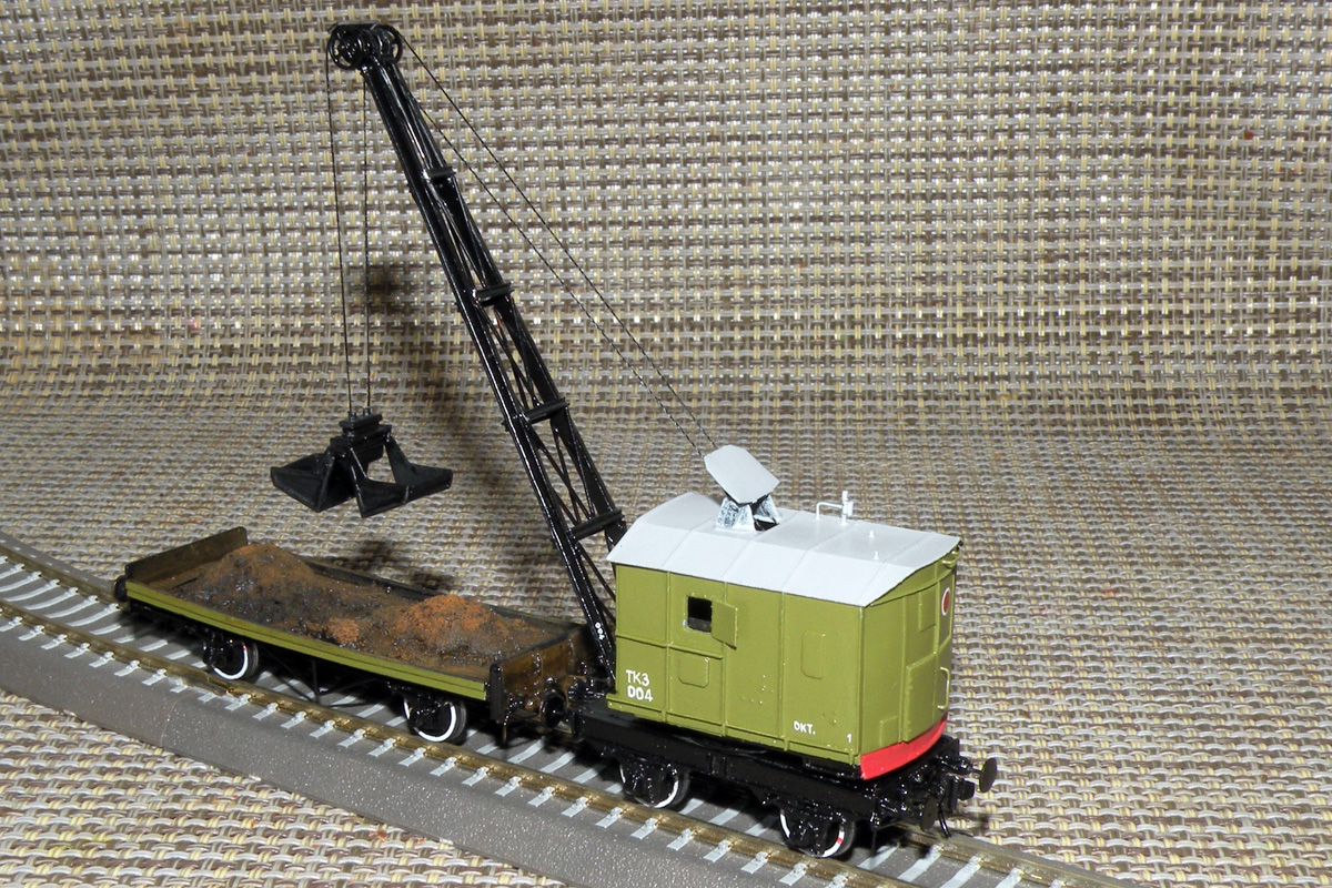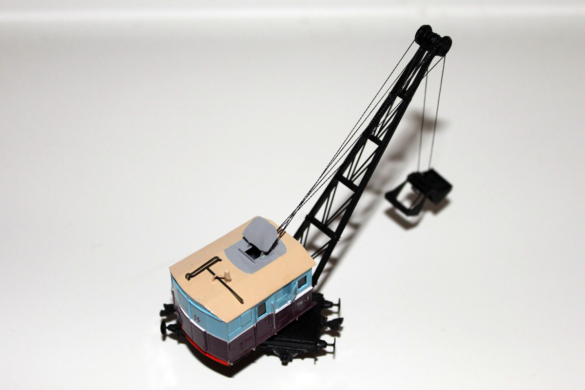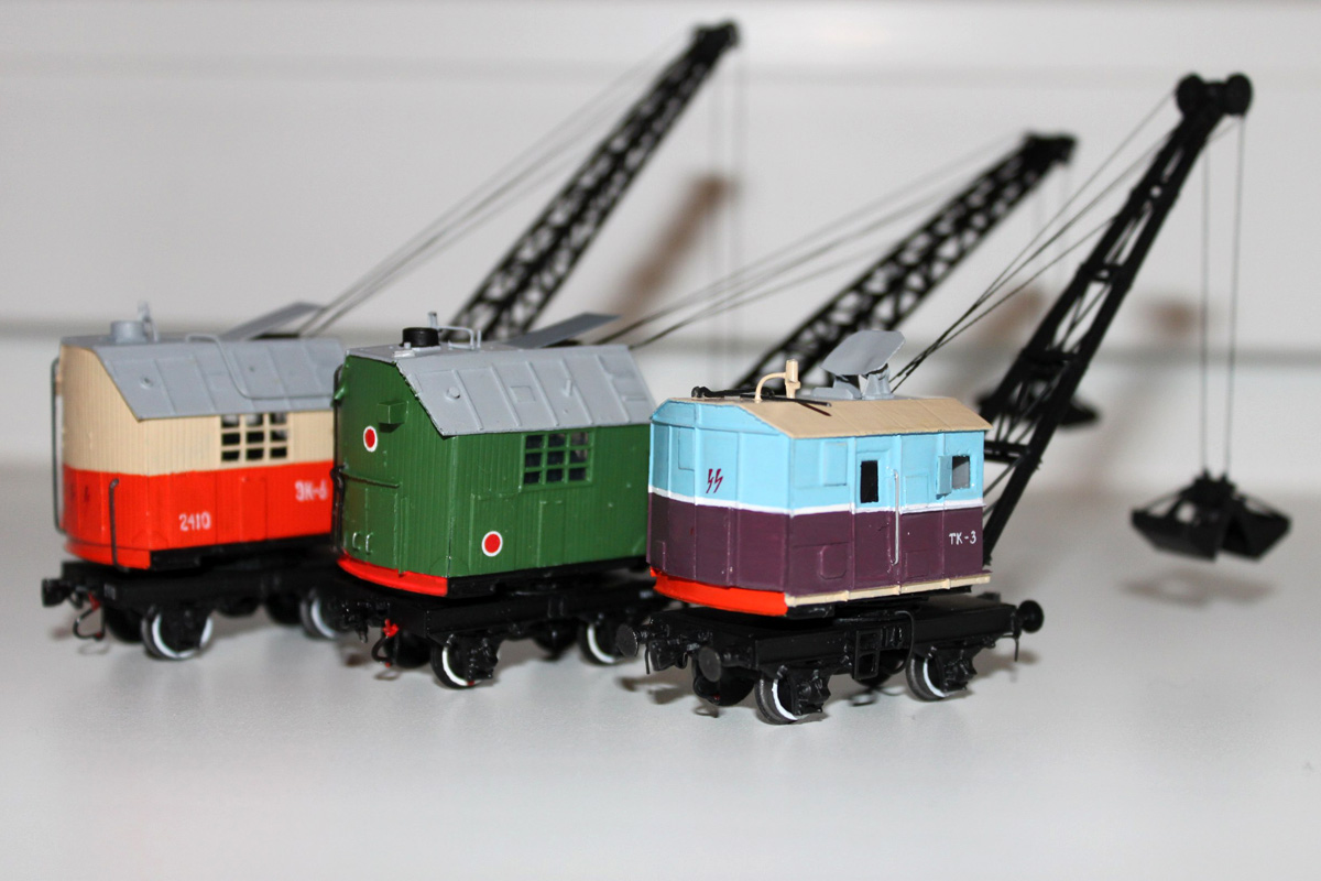Разновидности: окраска Эпоха: III-IV Фирма-производитель: ПО"НКТСЗ" Год начала производства: 2014 Год окончания производства: производится до настоящего времени Описание моделиМодель крана ТК3 с 2-осной подкрановой платформой (малая серия, производитель - ПО"НКТСЗ", Москва) была впервые представлена на Третьем подмосковном семинаре любителей ж.д. моделизма в ноябре 2014 г. Для изготовления работы используются отливки из эпоксидной смолы, в комплексе с другими материалами. На кране и на платформе выполнены динамические (поворотные) имитаторы автосцепок СА-3 и динамические (подпружиненные) буфера. Интересный факт. На моделях проставляются бортовые номера, соответствующие порядковому номеру модели. Описание прототипаВ послевоенные годы (1946-1950) Тихорецкий машиностроительный завод производил переделку паровых ж.д. кранов ПК6 в дизельные краны ТК3 грузоподъёмностью 3 т. Краны комплектовались грейферами обхемом 1,5 куб.м. Перемещение крана по путям допускалось со скоростью до 5 км/ч. Общее количество кранов, переделанных из ПК6 в ТК3 методом КВР, составило порядка 70 единиц.