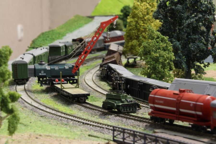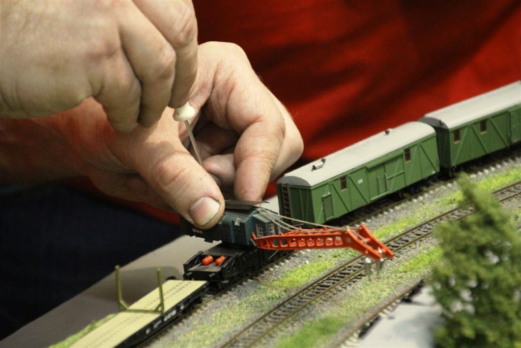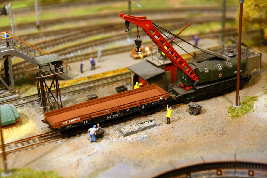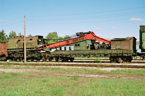 Кадр 7. Модель ж.д. крана ПЖ-45 в составе восстановительного поезда (окрасочная конверсия, автор А.Бахтин). Слева - подкрановая платформа, авторы А.Бахтин и С. Попов (Москва).