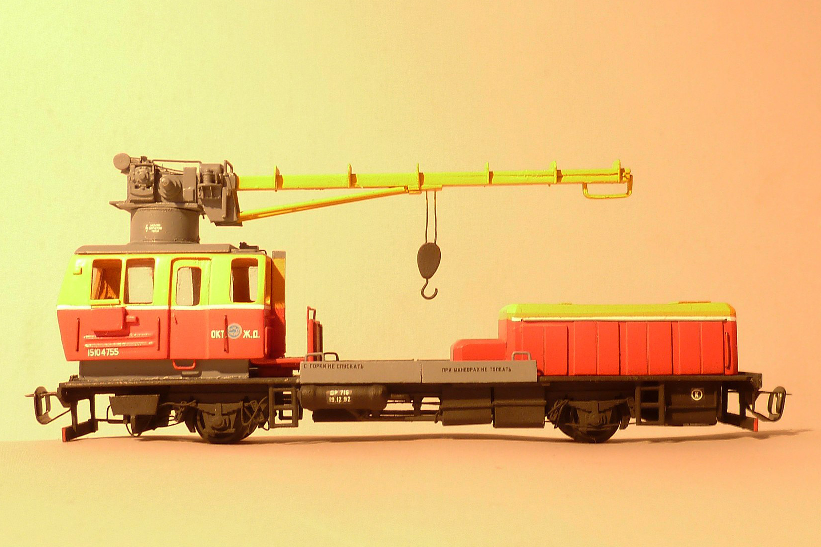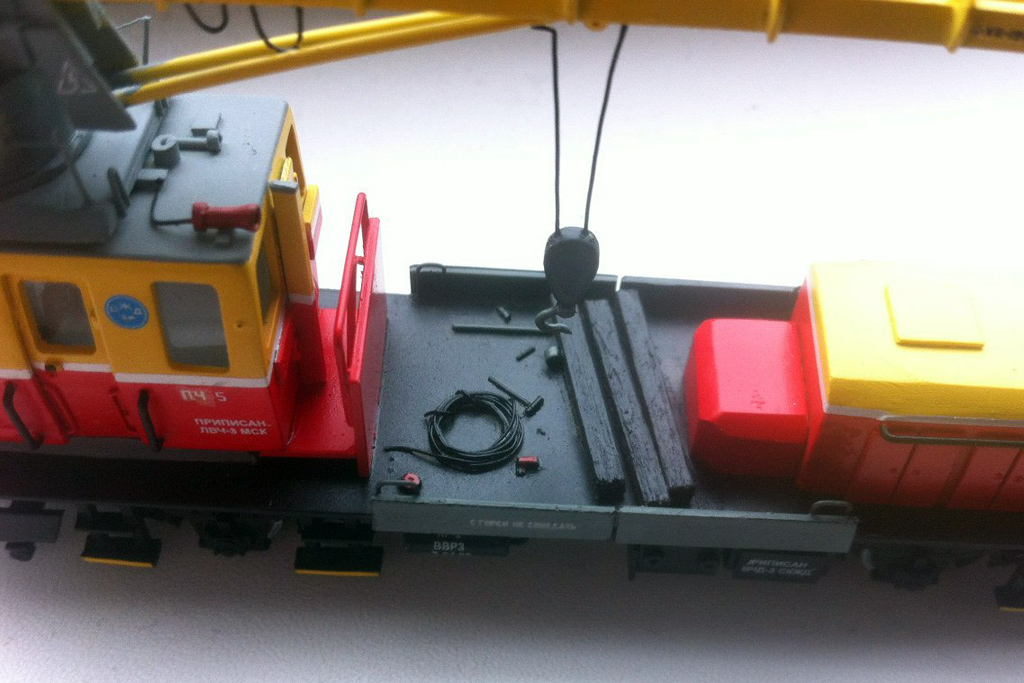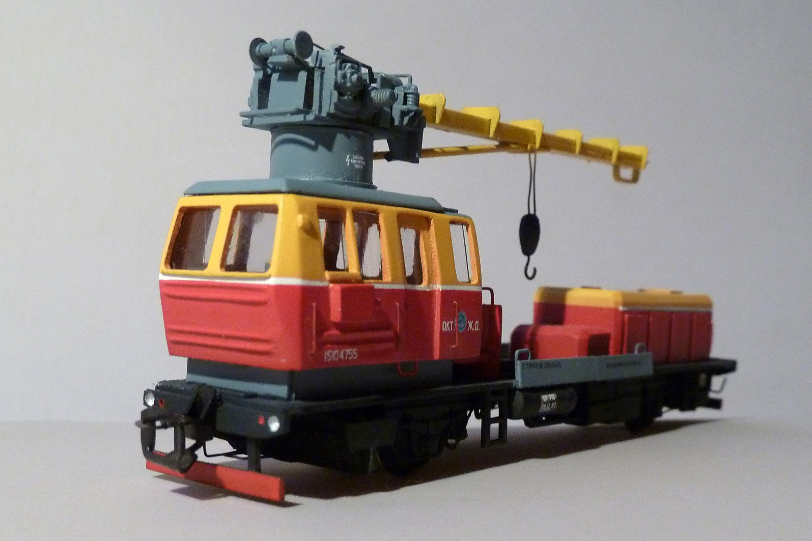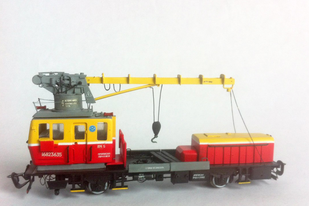Эпоха: V Принадлежность: РЖД Фирма-производитель: Прийменко В. Год начала производства: 2013 Описание моделиМодель дрезины МПТ4 самостоятельно изготовлена петербургским моделистом Вячеславом Прийменко в ноябре-декабре 2013 г. Модель стендовая. Один из экземпляров модели находится в коллекции К.Виноградова (СПб). Описание прототипаПМПТ4 — мотовоз погрузочно-транспортный - многофункциональная дрезина, получившая широкое распространение на сети отечественных железных дорог. Производится с 1985 г. по н.в. (изготовитель - Тихоорецкий машиностроительный завод). На конец 2013 г. построено более 1300 единиц в различных модификациях (отличаются силовой установкой, формой капота и т.д.). МПТ4 представляет собой самоходный двухосный экипаж с двигателем внутреннего сгорания или дизельным двигателем. На передней консоли расположена несущая кабина с грузоподъёмным краном консольного типа. На задней консоли под капотом находится силовая установка, передающая мощность через клиноременную передачу на трёхфазный генератор, а через гидропередачу и карданный привод — на осевые редукторы колёсных пар и компрессор. Назначение: погрузка и выгрузка;перевозка грузов на прицепных платформах; перевозка длинномерных грузов, в том числе рельсов 25 м, на собственной и прицепной платформах; перевозка рабочих бригад к месту работ; проведение маневровых работ на станционных путях; проведение сварочных работ в полевых условиях; питание потребителей электроэнергией 380/220 В, 50 Гц; питание потребителей воздухом под давлением 8 атм.; использование в качестве головной машины в составе комплекса для текущего содержания пути. Конструкционная скорость в поездном режиме - 100 км/ч. Грузоподъёмность платформы — 8 т. Максимальная грузоподъёмность крана с дополнительными опорами на вылете 7,5 м — 2,2 т. Пассажировместимость — 11 человек.