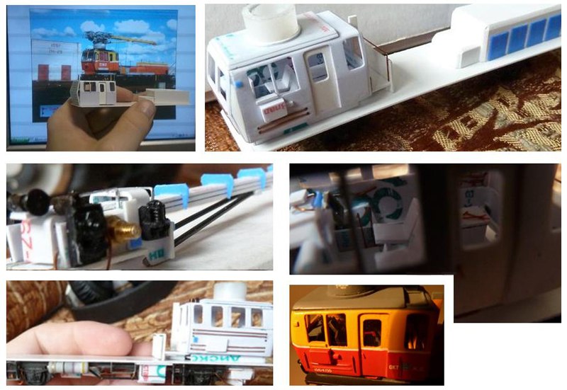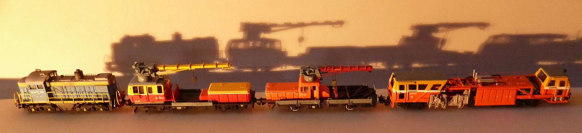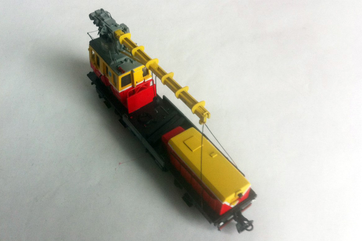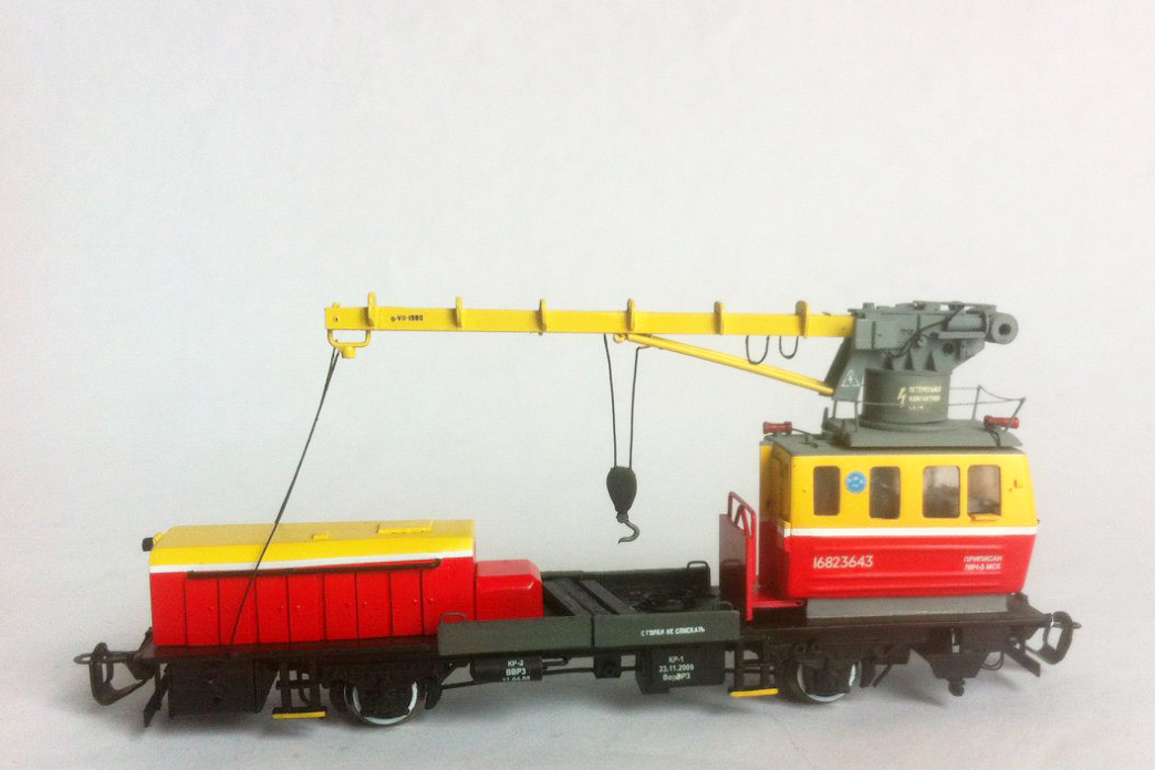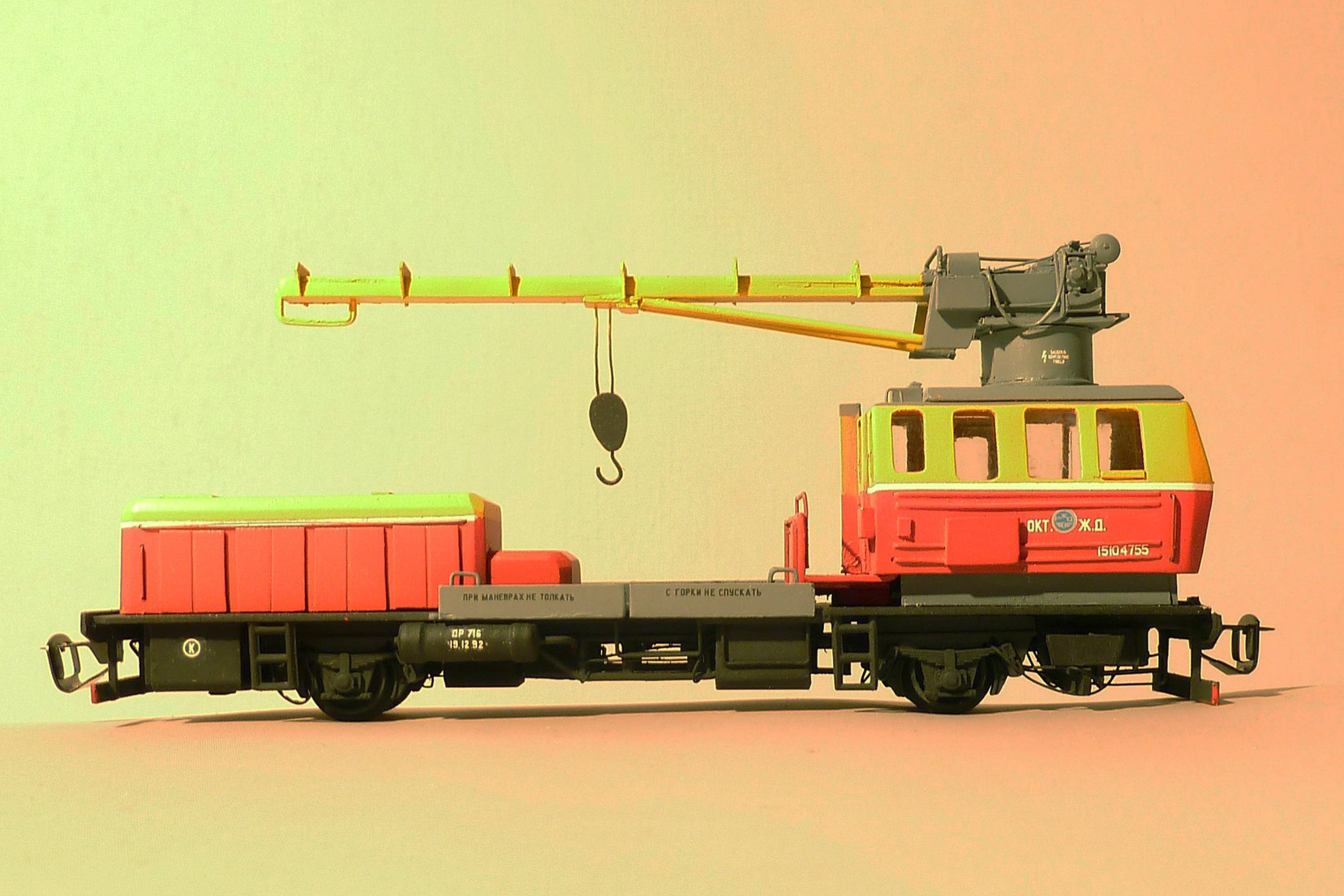 Эпоха: V Принадлежность: РЖД Фирма-производитель: Прийменко В. Год начала производства: 2013 Описание моделиМодель дрезины МПТ4 самостоятельно изготовлена петербургским моделистом Вячеславом Прийменко в ноябре-декабре 2013 г. Модель стендовая. Один из экземпляров модели находится в коллекции К.Виноградова (СПб). Описание прототипаПМПТ4 — мотовоз погрузочно-транспортный - многофункциональная дрезина, получившая широкое распространение на сети отечественных железных дорог. Производится с 1985 г. по н.в. (изготовитель - Тихоорецкий машиностроительный завод). На конец 2013 г. построено более 1300 единиц в различных модификациях (отличаются силовой установкой, формой капота и т.д.). МПТ4 представляет собой самоходный двухосный экипаж с двигателем внутреннего сгорания или дизельным двигателем. На передней консоли расположена несущая кабина с грузоподъёмным краном консольного типа. На задней консоли под капотом находится силовая установка, передающая мощность через клиноременную передачу на трёхфазный генератор, а через гидропередачу и карданный привод — на осевые редукторы колёсных пар и компрессор. Назначение: погрузка и выгрузка;перевозка грузов на прицепных платформах; перевозка длинномерных грузов, в том числе рельсов 25 м, на собственной и прицепной платформах; перевозка рабочих бригад к месту работ; проведение маневровых работ на станционных путях; проведение сварочных работ в полевых условиях; питание потребителей электроэнергией 380/220 В, 50 Гц; питание потребителей воздухом под давлением 8 атм.; использование в качестве головной машины в составе комплекса для текущего содержания пути. Конструкционная скорость в поездном режиме - 100 км/ч. Грузоподъёмность платформы — 8 т. Максимальная грузоподъёмность крана с дополнительными опорами на вылете 7,5 м — 2,2 т. Пассажировместимость — 11 человек.