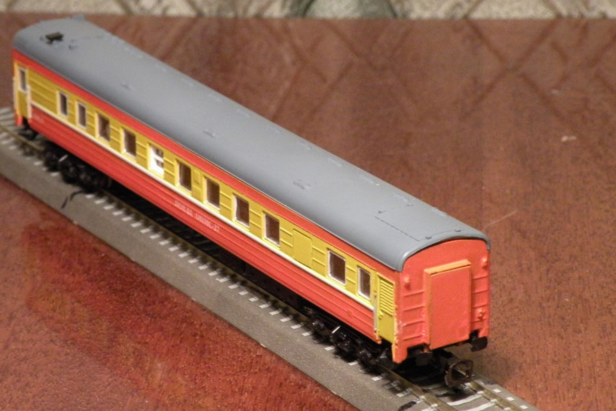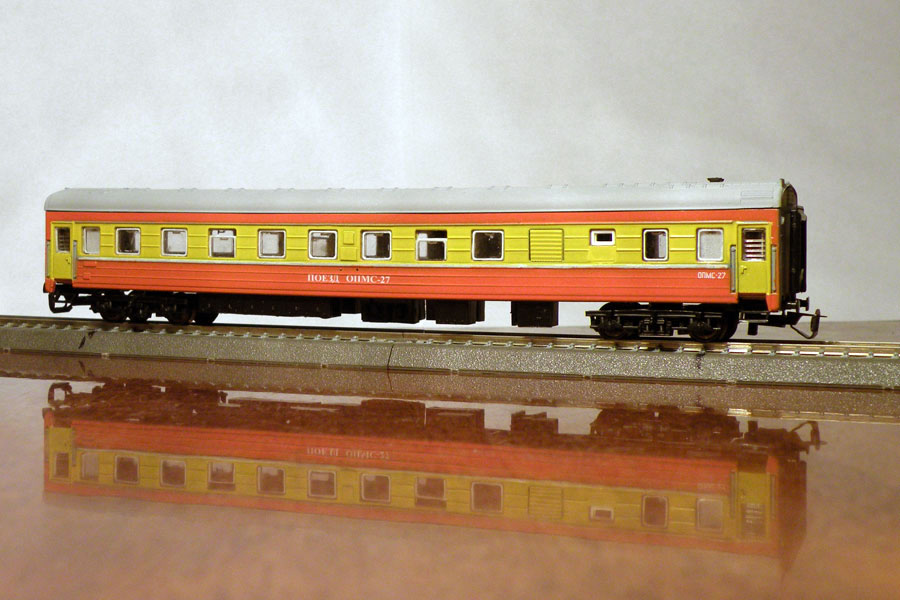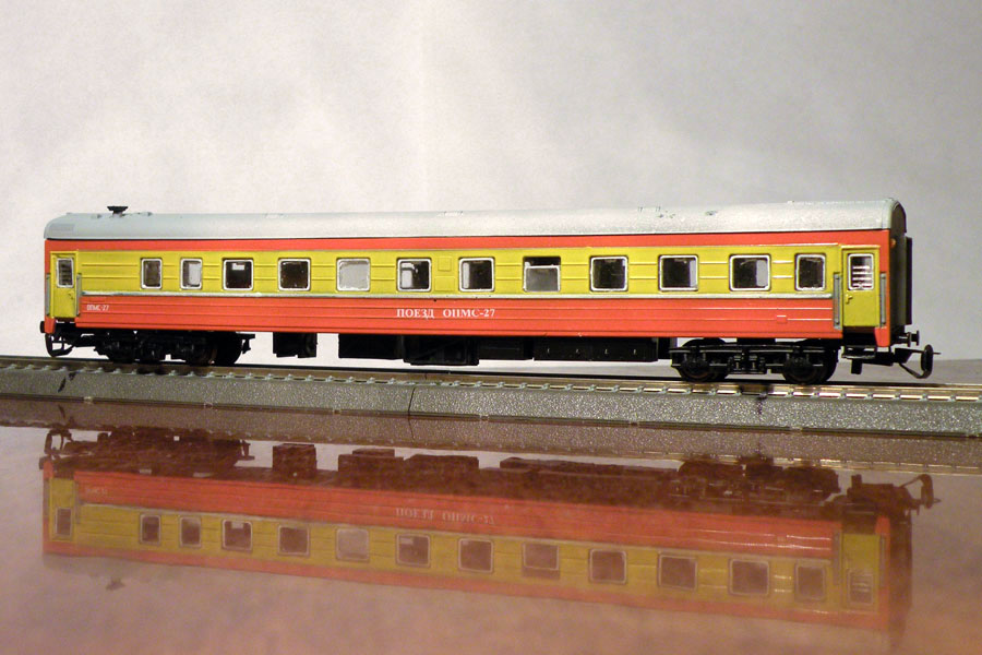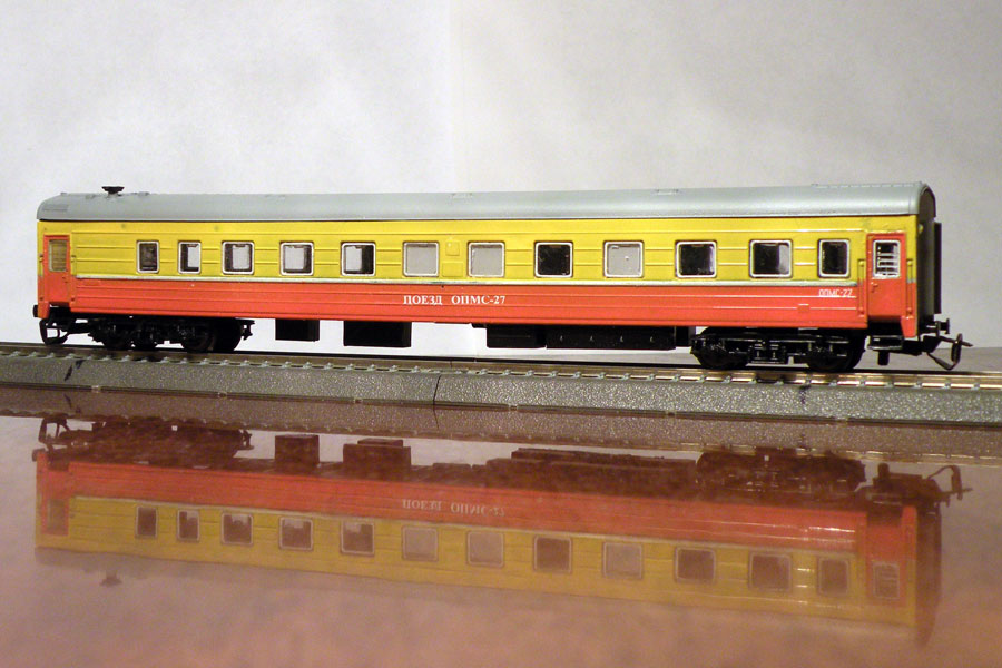 Эпоха: V Принадлежность: РЖД Фирма-производитель: Дворников С. Год начала производства: 2010 Описание моделиМодели (три различных вагона в составе ОПМС) изготовлены московским моделистом Сергеем Дворниковым и впервые экспонировались на выставке в Раменском в 2010 г. Конверсии выполнены на основе моделей серийных пассажирских ЦМВ производства фирмы "ТТ-Модель".