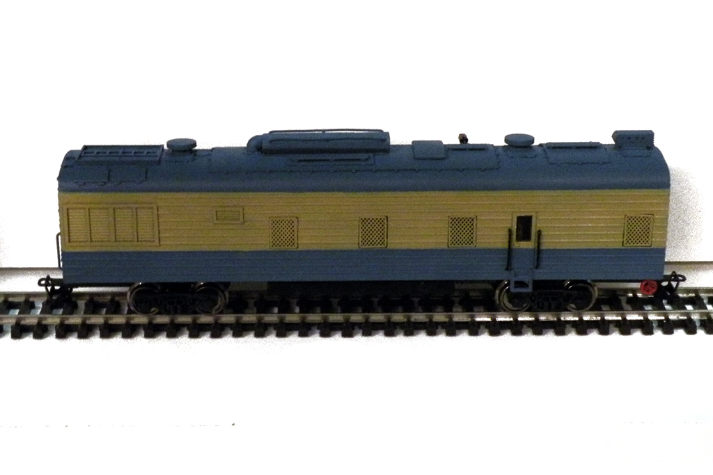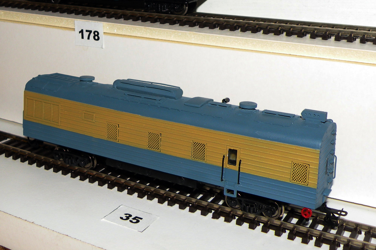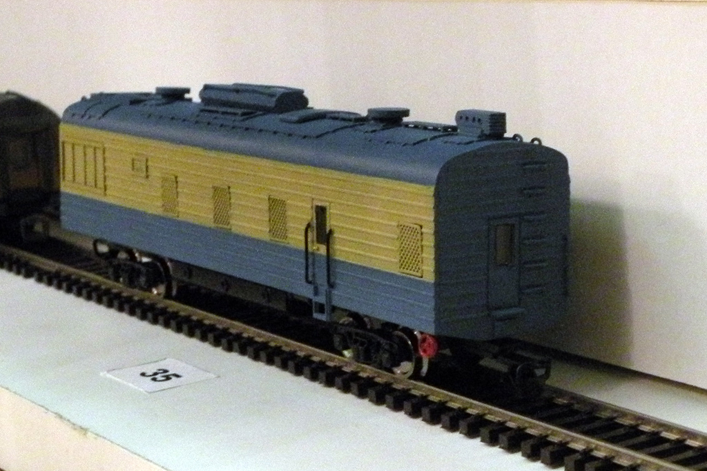 Кадр 1. Модель вагона-электростанции ПЭ6 (пока без надписей) на выставке в ЦМЖТ, март 2016 г.