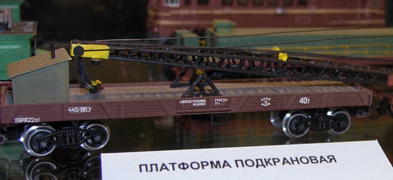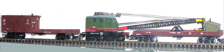 Эпоха: IV-V Принадлежность: СЖД-PЖД Фирма-производитель: М.Кечетов Описание моделиМодель крана КДЭ-151 собрана московским моделистом М.Кечетовым на основе деталей, изготовленых с помощью пресс-формы, созданной в 1980-х гг. В.Дёминым, и установлена на тележки от "Пересвета". Подкрановая платформа создана (как и её прототип) на основе крытого вагона (модель "Пересвета") путём укорачивания кузова до четырёх нижних досок. Описание прототипаПрототип подкрановой платформы был обнаружен М.Кечетовым в 2004 г. в депо Суоярви Октябрьской ж.д.