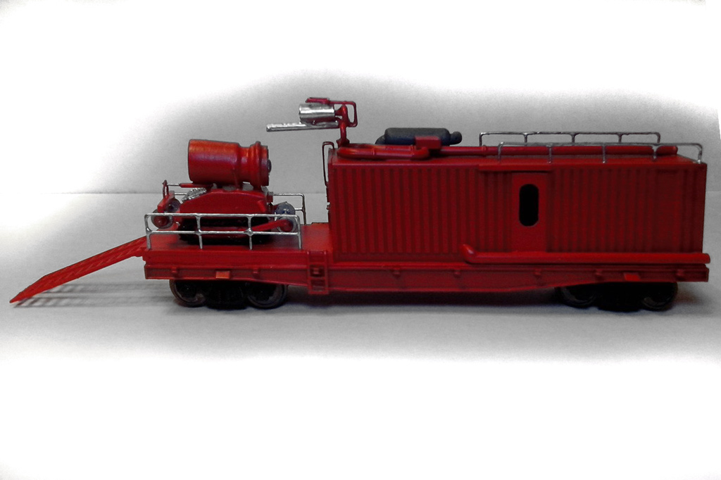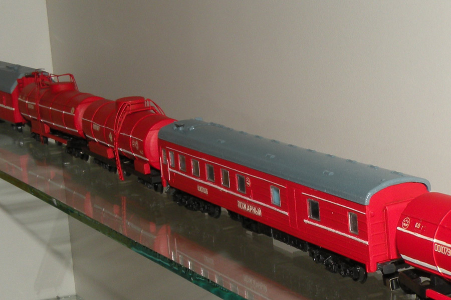 Модель пожарного поезда изготовлена петербургским моделистом Владимиром Деруновым. В составе поезда пять вагонов. Три цистерны - полностью самостоятельного изготовления (использованы только тележки тиа "Даймонд" фирмы "Пересвет"). Служебный вагон изготовлен на основе модели ЦМВ фирмы "ТТ-Модель". В 2008 г. в составе появился вагон-гараж.