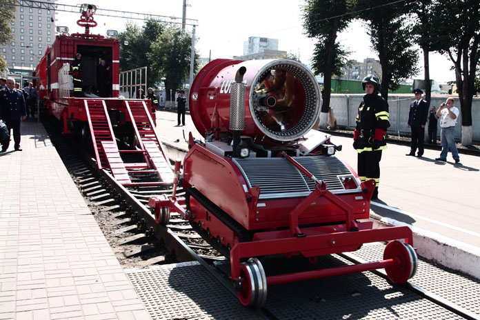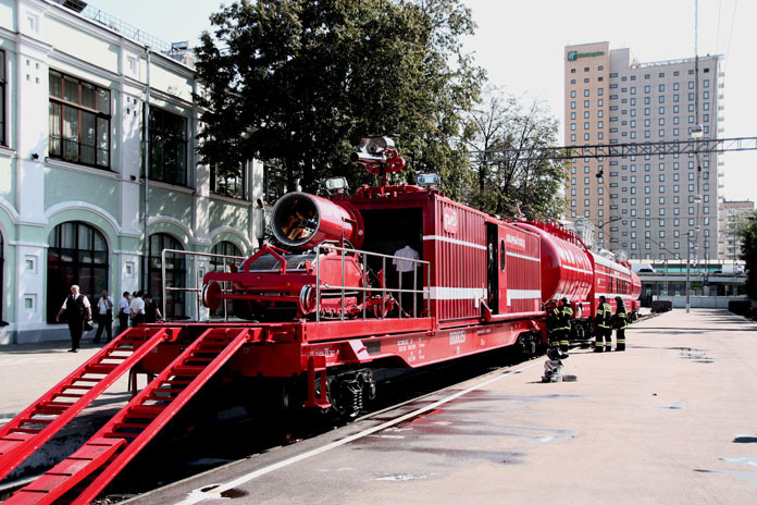 Кадр 13. Современный пожарный поезд с роботом пожаротушения во время презентации, Рижский вокзал, Москва.