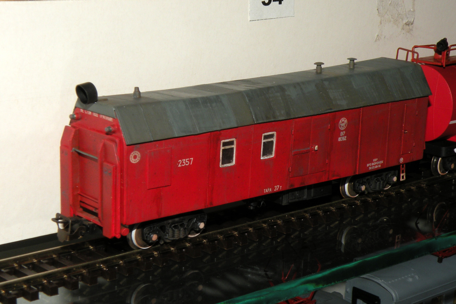 Разновидности: модель выполнена в единственном экземпляре Эпоха: V Принадлежность: РЖД Фирма-производитель: Прийменко В. Год начала производства: 2016 Описание моделиМодель вагона-гаража пожарного поезда - авторская работа петербургского моделиста Вячеслава Прийменко. Модель выполнена "с нуля", для ее изготовления использованы ПВХ пластик толщиной 1 мм, полистирол, медная проволока. Использованы тележки ЦНИИ-Х3О и сцепки от фирмы "Пересвет". При окраске модели использована техника "состаривания" Модель впервые экспонировалась на традиционной выставке в Центральном музее ж.д. транспорта в Санкт-Петербурге в марте 2016 г., в составе малосерийной модели пожарного поезда ("Пересвет"), доработанной В.Прийменко. Другие модели вагонов-гаражей в составе пожарных поездов: - от В.Дерунова; - от М.Кечетова; - от С.Попова (Москва). Другие модели вагонов-гаражей: - в составе восстановительного поезда от С.Попова (Москва).