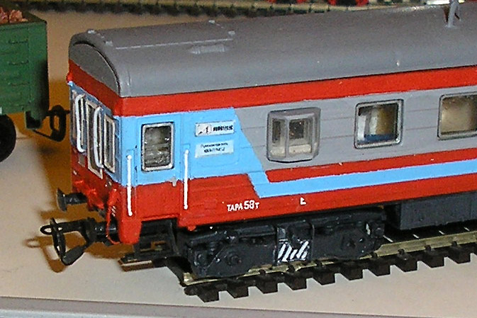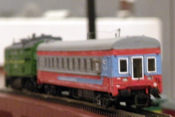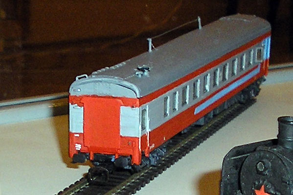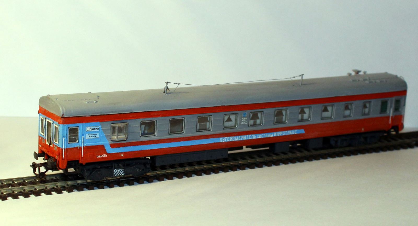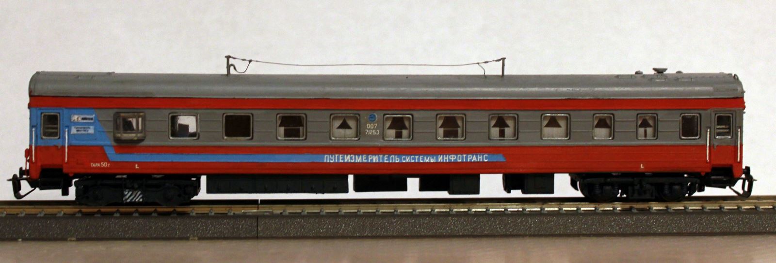 Эпоха: V Принадлежность: РЖД Фирма-производитель: Ватаев А. Год начала производства: 2007 Описание моделиМодель вагона-путеизмерителя КВЛ-П1МП.2 изготовлена петербургским моделистом Андреем Ватаевым и впервые экспонировалась на выставке "Железнодорожный моделизм-2007" в ЦМЖТ. Модель вагона выполнена путем конверсии вагона ЦМВ от ТТ-модель. Тележки изготовлены на основе серийно выпускаемых тележек от фирм «Пересвет» (рама и буксовые узлы) и ТТ-модель (узел центрального подвешивания и поводки). Рама измерительной тележки изготовлена самостоятельно по фотографиям реальной тележки. Изменено крышевое и внутривагонное оборудование, подвагонное оборудование оставлено без изменений. Описание прототипаВагон КВЛ-П1МП.2 (Компьютеризированный вагон-лаборатория, путеизмерительный) предназначен для автоматизированного контроля состояния пути на скорости до 100 км/час. Серийный выпуск вагонов-лабораторий КВЛ начат с 1997 г. в МПЦ "Инфотранс" (г. Самара). Их изготавливают на базе купейного пассажирского вагона завода Аммендорф (Германия) с климатической установкой (КВЛ-П1МП.2) и на базе купейного пассажирского вагона Тверского вагоностроительного завода с климатической установкой (КВЛ-П1МП.2.Т). Более подробную информацию можно получить на сайте производителя www.rzd.ru или в журнале "ПУТЬ И ПУТЕВОЕ ХОЗЯЙСТВО" № 05/2004 г. Благодарим Андрея Ватаева за предоставленную информацию.