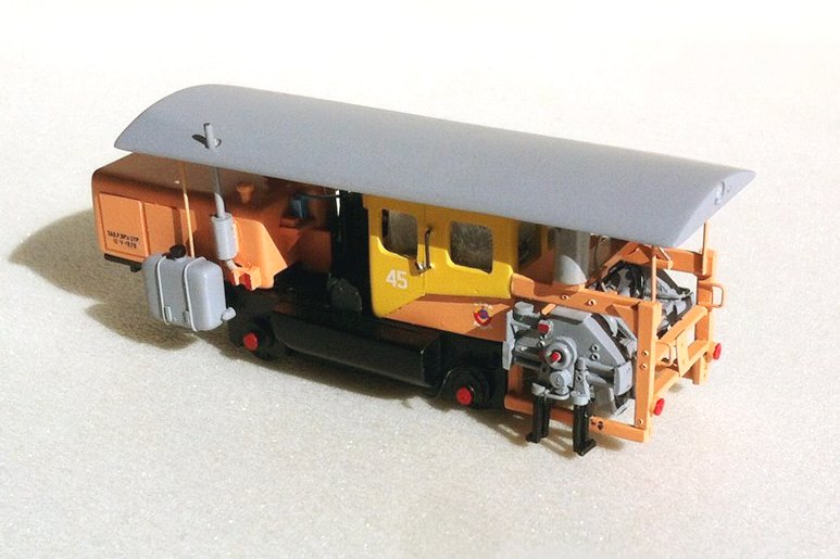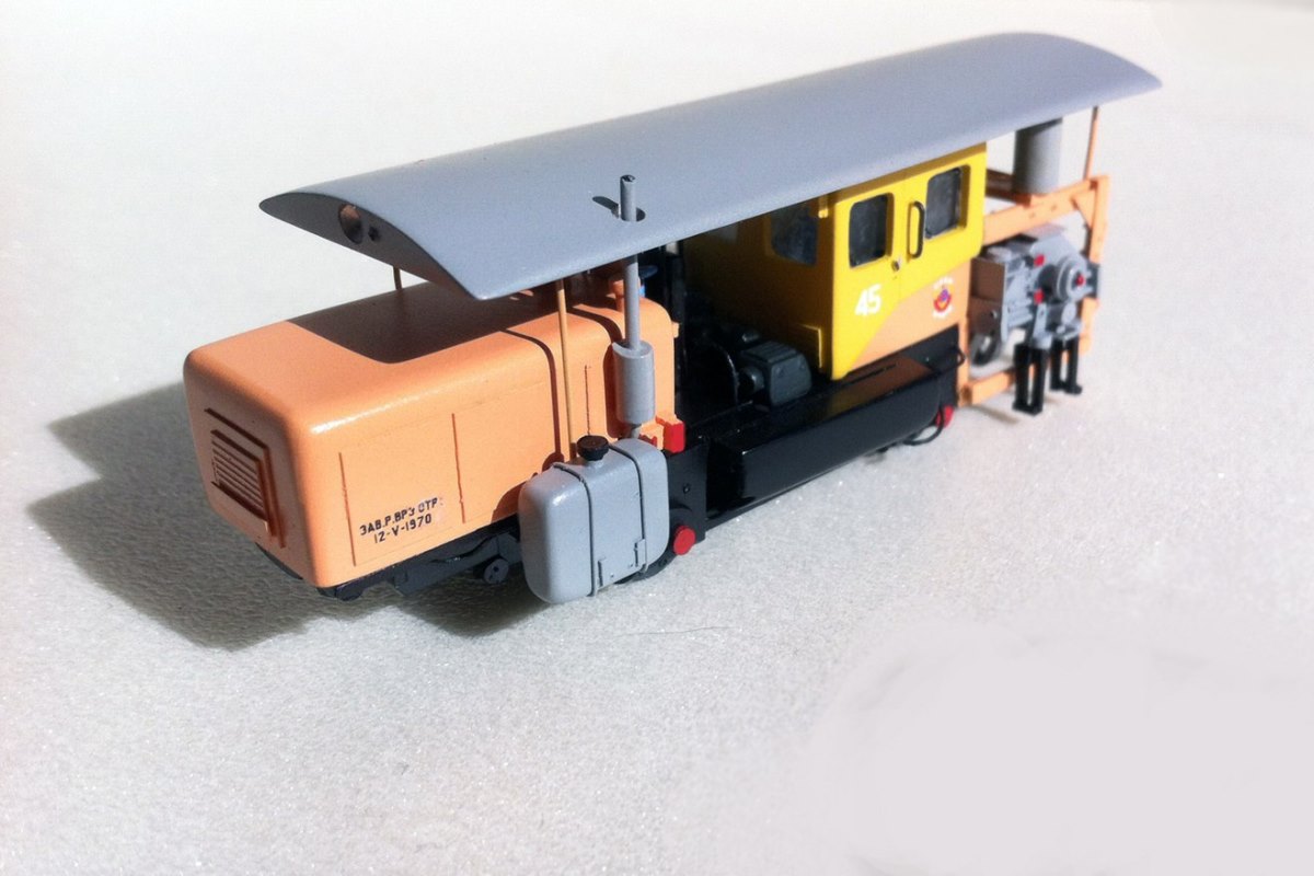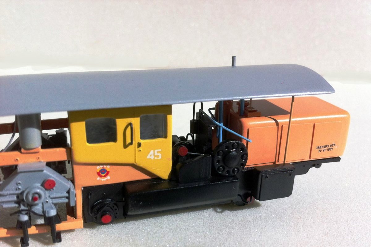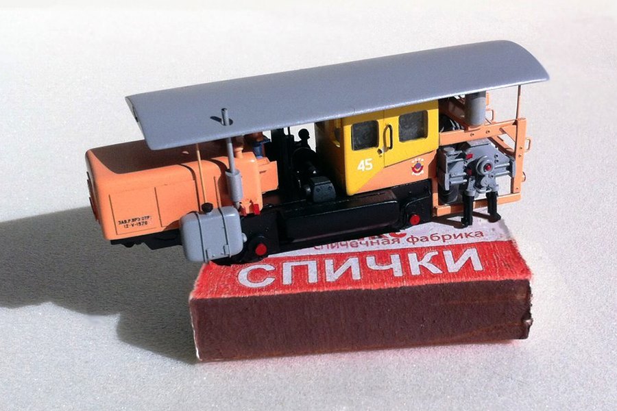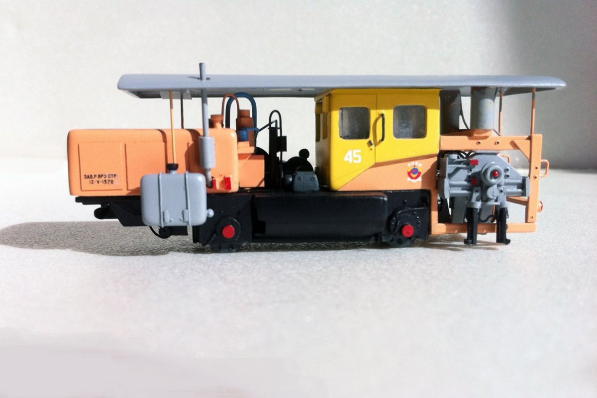 Разновидности: модель выполнена в одном экземпляре Эпоха: IV Принадлежность: СЖД Фирма-производитель: Прийменко В. Год начала производства: 2017 Описание моделиМодель шпалоподбивочной машины ШПМ изготовлена "с нуля" петербургским моделистом Вячеславом Прийменко в 2017 г. Модель стендовая. Для изготовления корпуса использованы пвх (1,5 мм), полистирол, медная проволока. Оригинальные колёса изготовлены самостоятельно. Незавершенная модель впервые экспонировалась на традиционной выставке "Железнодорожная модель - 2017" в Центральном музее ж.д. транспорта (Санкт-Петербург). Описание прототипаШпалоподбивочная машина — путевая машина для подачи балласта под шпалы и его уплотнения. Применяется при строительстве, ремонте и текущем содержании железнодорожного пути. Самоходная шпалоподбивочная машина ШПМ-02 выпускалась с 1961 года кировским заводом им.1 Мая. В качестве силовой установки применялись двигатели У2Д6 или К-270 мощностью 120 л.с. Производительность машины 350-400 шпал в час. Транспортная скорость - до 36 км/час; при подбивке шпал - 3,3 км/час. Одна из сохранившихся машин ШПМ-02 - экспонат ж.д. музея в Барановичах (Беларусь).