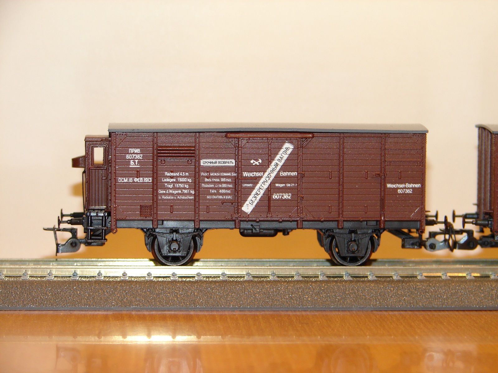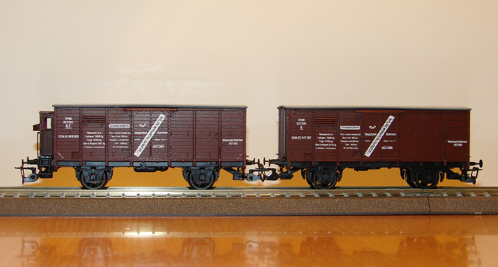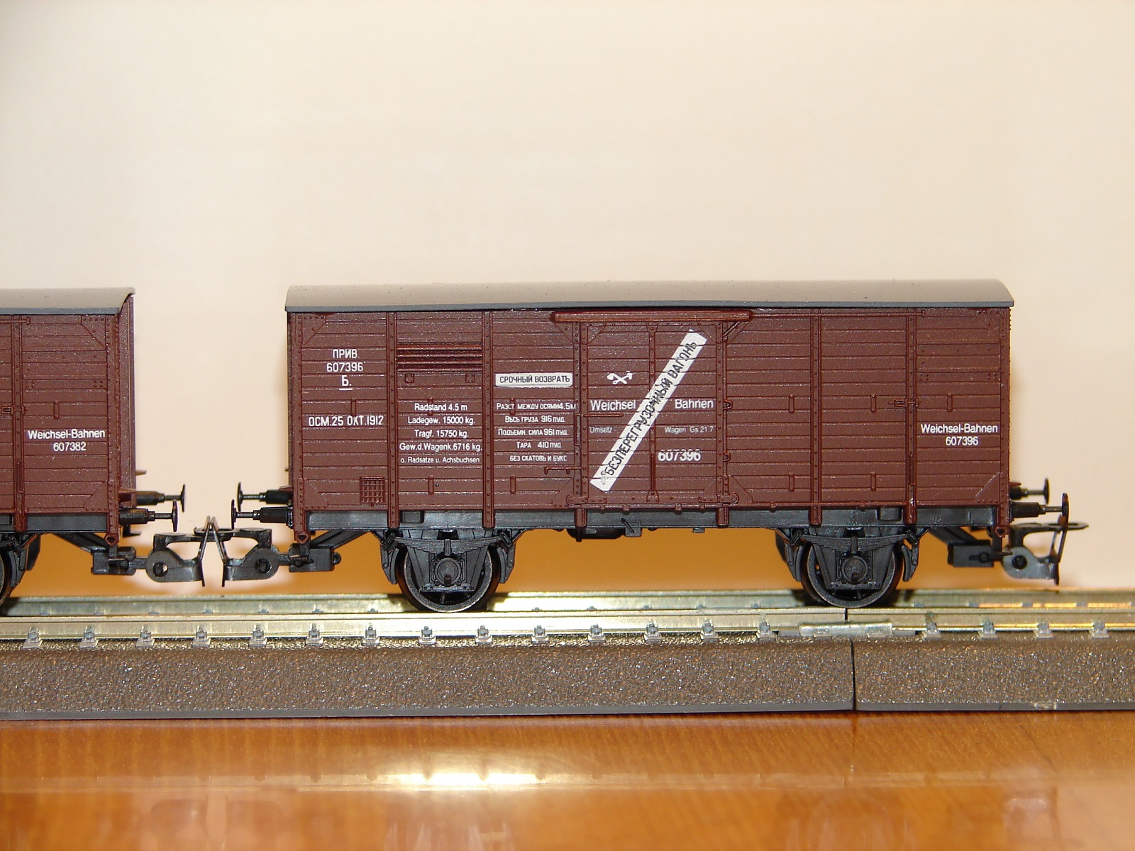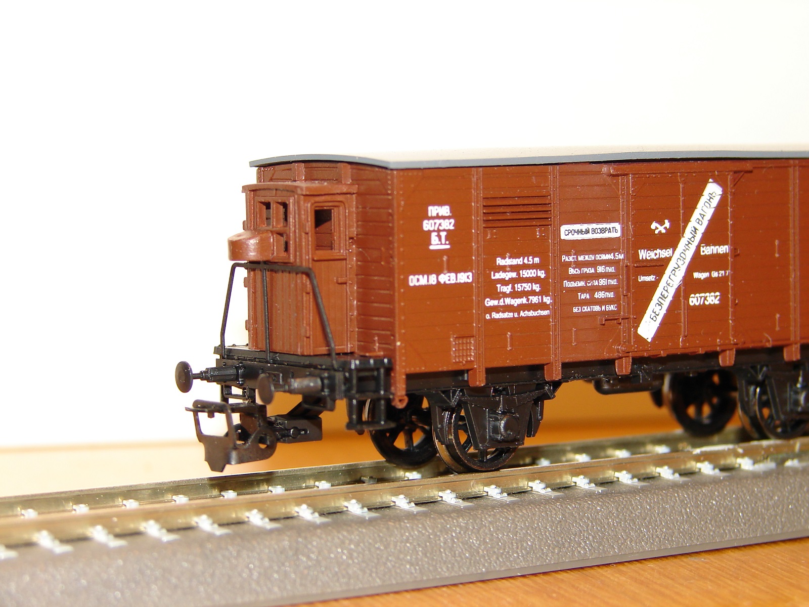 Разновидности: с тормозной будкой и без тормозной будки Эпоха: I Принадлежность: железные дороги Российской империи Фирма-производитель: Пересвет Год начала производства: 2018 Год окончания производства: 2018 Описание моделиНабор из двух различных крытых вагонов системы Брайтшпрехера относится к числу «Юбилейных» лимитированных серий, выпущенных «Пересветомх» в 2018 г. к своему 25-летию. Модели представляют собой несколько переделанные для соответствия прототипу модели Прусских товарных вагонов серии G10 фирмы «Хэдль». Материал – пластик АБС. Наборы были выпущены в продажу в сентябре 2018 г. Общий тираж – 50 наборов. Из особенностей моделей отметим динамические сцепки и прилагаемые к вагонам мелкие детали для самостоятельной установки. Модели оснащены спицованными колёсными парами, что характерно для первой эпохи. Описание прототипаВ 1906 г. было подписано соглашение о бесперегрузочном сообщении между железнодорожными ведомствами России, Австрии и Пруссии. Для организации подобного сообщения были выпущены товарные вагоны, специально приспособленные для простой и быстрой замены колёсных пар. В частности, в углах рамы были предусмотрены упоры для домкратов, а крепление букс было легкосъёмным. В качестве базовых конструкций использовались обычные вагоны европейских серий, как подходящие по габаритам. Проект всех изменений был разработан инженером Брайтшпрехером. По предложению Российского МПС на крытых вагонах тормозная будка была перенесена с крыши на раму вагона. Считалось, что в условиях русской зимы тормозильщику в тулупе и в валенках будет опасно подниматься по обледенелым ступенькам. Вагоны для бесперегрузочного сообщения строились многими Российскими и европейскими заводами, в частности Путиловским и Русско-балтийским. После революции в России использование этих вагонов по их назначению было прекращено из-за резкого сокращения международной торговли.