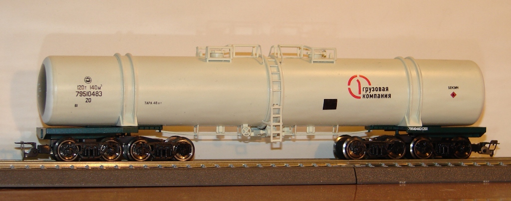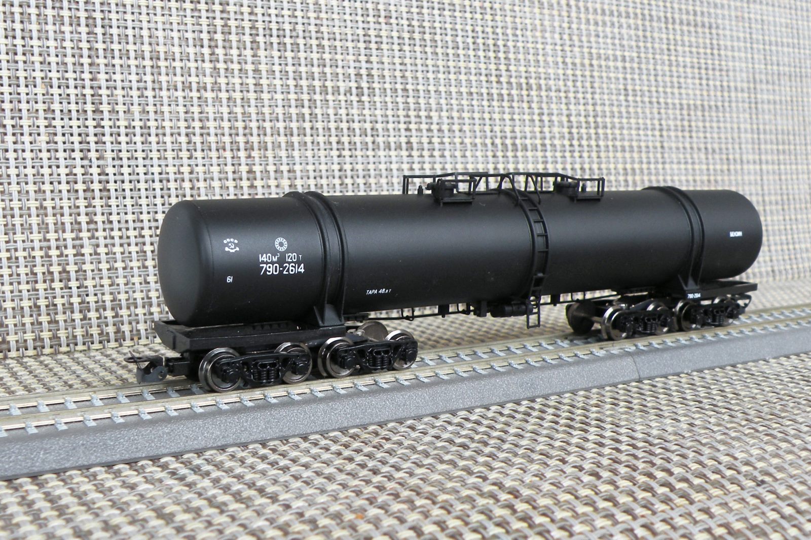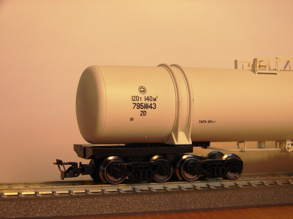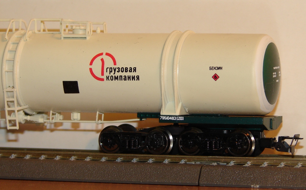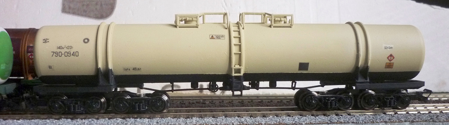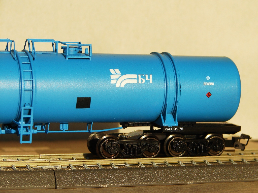 Эпоха: IV-V Принадлежность: СЖД, РЖД, БЧ Фирма-производитель: Пересвет Год начала производства: 2016 Артикул: 3750, 3751, 3752, 3753, 3754, 3755 Описание моделиПилотный образец серийной модели 8-осной цистерны для перевозки нефтепродуктов петербургская фирма "Пересвет" впервые продемонстрировала в дни традиционной выставки в ЦМЖТ (СПб) в марте 2016 г. Первая партия моделей - чёрная цистерна с надписями IV эпохи (арт. 3750) - появилась в продаже в конце лета 2016 г. В марте 2017 г. поступила в продажу бежевая цистерна, IV эпоха (арт. 3751). Модель в бежевой окраске с надписями, характерными для V эпохи (арт. 3752) появилась в продаже в конце февраля 2019 г.. В июне 2020 г. появилась в продаже модель в окраске Белорусской железной дороги БЧ (арт. 3754). Окраска и надписи соответствуют пятой модельной эпохе, конструктивно цистерна не отличается от ранее выпущенных вариантов. В феврале 2024 г. появилась в продаже модель в в версии "Лукойл" пятой модельной эпохи. Артикул модели 3755. Конструкция ходовой части модели обеспечивает прохождение радиусов: на подъёмах и спусках - 310 мм, на горизонтали - 286 мм. Другие модели восьмиосной цистерны: - от "Б.В.-Ж.Д." (малая серия); - от К.Виноградова; - от В.Дерунова; - от Д.Телепова.