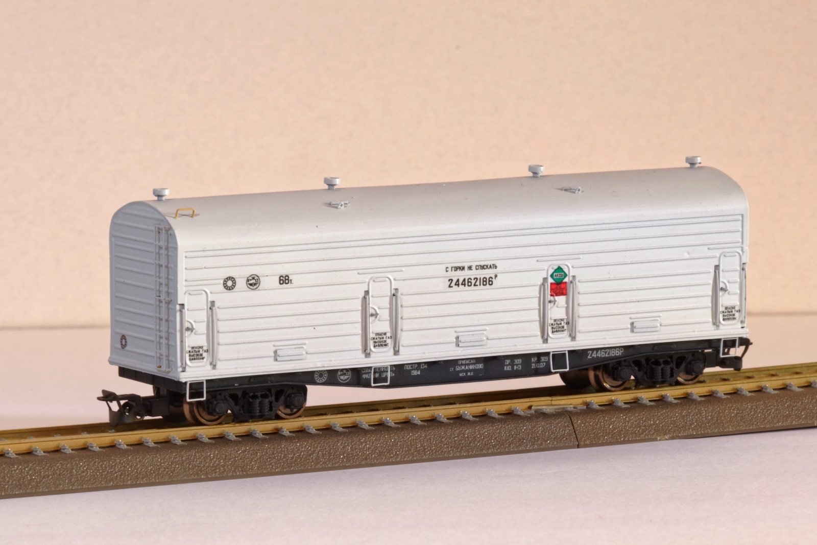 Разновидности: цвет (бежевый, белый); номер (два варианта) Эпоха: V Принадлежность: РЖД Фирма-производитель: Норкин-модель Год начала производства: 2015 Описание моделиМодели 4-осных вагонов для перевозки гелия впервые были представлены полностью готовыми (в двух вариантах окраски - белой и бежевой) в составе корпоративной экспозиции Мануфактуры "Норкин-модель" в марте 2015 г., на выставке в ЦМЖТ, Санкт-Петербург. К этому же времени завершено изготовление первой партии моделей, которые можно приобрести у изготовителя. Корпус вагона из травлёной латуни может быть смонтирован либо на серийной 4-осной платформе производства фирмы "Пересвет", либо на металлическую модель аналогичной платформы (мод. 13401 или 134012), имеющуюся в гамме продукции Мануфактуры "Норкин-Модель". Описание прототипаОфициальное название этого вагона - "железнодорожный агрегат для перевозки газообразного гелия", мод. 11Г114. Изготавливался на вагоностроительном заводе им. Газеты "Правда", на базе платформы модели 13-401, а затем 13-4012. Внутри оборудован тремя секциями баллонов, каждая из которых имеет по 23 баллона (всего 69 баллонов). Для обслуживания вагона имеется пять дверей - четыре с одной стороны и одна с противоположной.