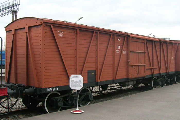 Кадр 2. 4-осный товарный вагон "американского типа" в музее на Варшавском вокзале, Петербург.