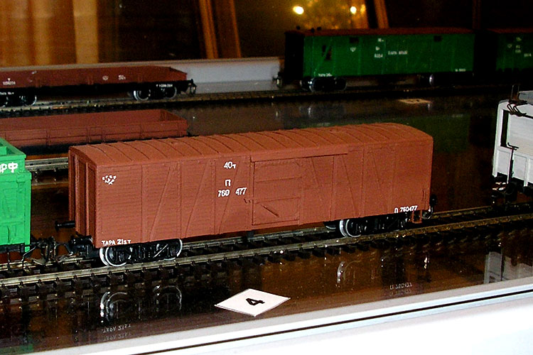 Кадр 1. Модель 4-осного товарного вагона "американского типа" на выставке в Политехническом музее, Москва.