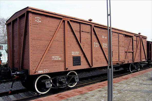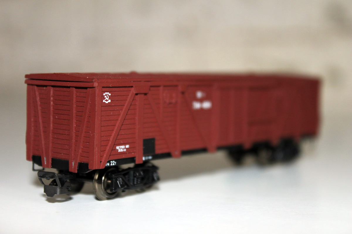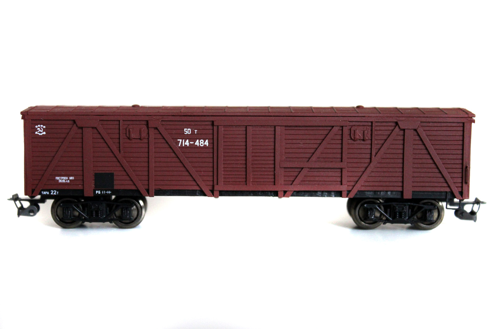 Эпоха: III, IV Принадлежность: СЖД. Фирма-производитель: А.Загребельский Описание моделиЗа некоторое время до того, как фирма "Пересвет" приступила к выпуску серийной модели 50-тонного вагона, модель этого прототипа была изготовлена мелкой серией московским моделистом А.Загребельским.Материал корпуса - пластик. Одна из моделей была собрана из "кита" и окрашена петербургским моделистом К.Виноградовым, с использованием тележек и сцепок от "Пересвета". Другие модели крытого товарного вагона грузопод. 50 т: - нетормозной от "Пересвета" (серийная модель); - тормозной от "Пересвета" (серийная модель); - от А.Мурашова. Описание прототипаКрытый 4-осный вагон с деревянной обшивкой кузова грузоподъёмностью 50 т (модель 11-38) производился в СССР в 1936-41 и 1946-54 гг. За всё время было произведено 48 630 единиц вагонов данной модели.