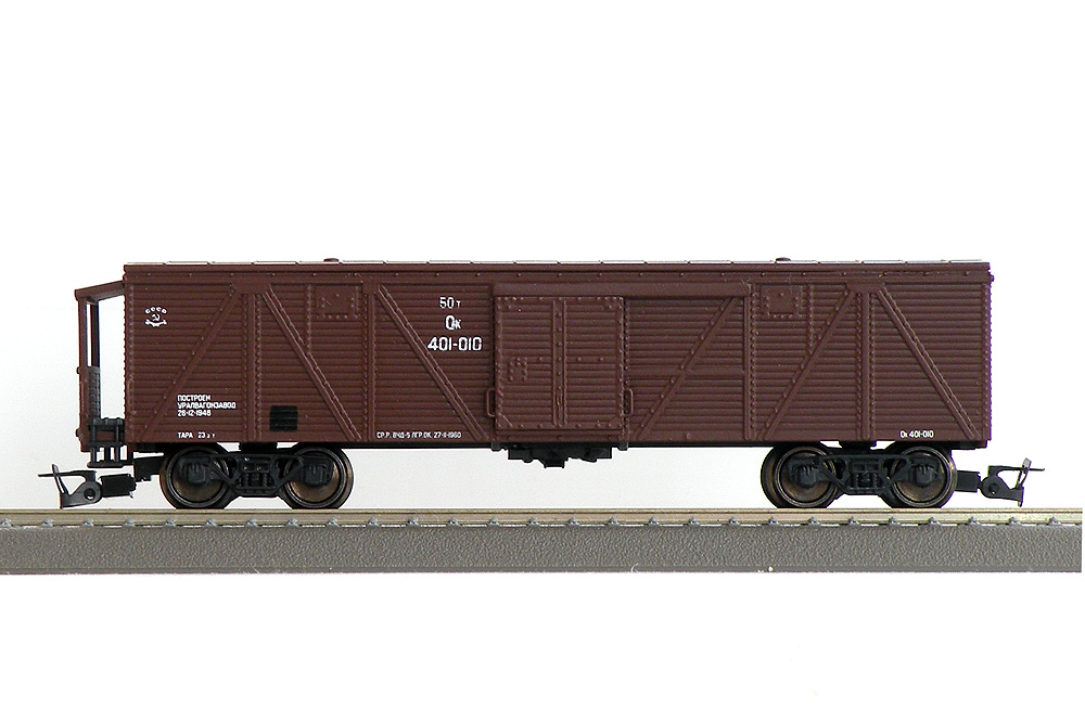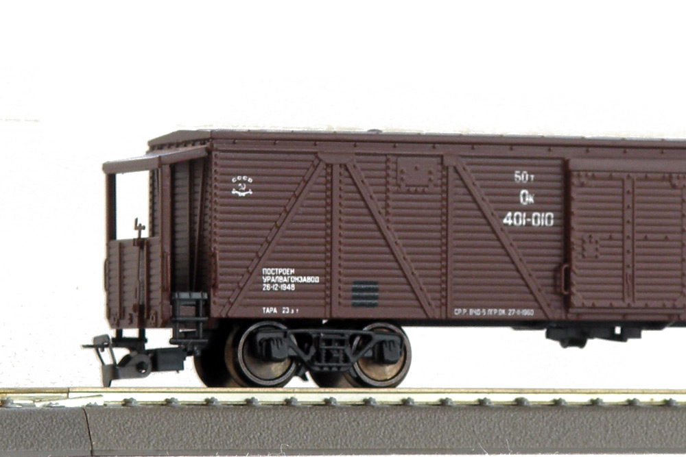 Эпоха: III-IV Принадлежность: СЖД Фирма-производитель: Пересвет Год начала производства: 2011 Год окончания производства: производится по настоящее время Артикул: 3514, 3515 Описание моделиМодель крытого тормозного вагона грузоподьъёмностью 50 т. производится "Пересветом" на базе выпускавшейся ранее модели аналогичного нетормозного вагона. На тормозной модели установлены тележки типа МТ50. Другие модели крытого товарного вагона грузопод. 50 т: - нетормозной от "Пересвета" (серийная модель); - от А.Мурашова; - от А.Загребельского. Описание прототипаКрытый 4-осный вагон с деревянной обшивкой кузова грузоподъёмностью 50 т производился в СССР в 1936-41 и 1946-54 гг. За всё время было произведено 48 630 единиц вагонов данной модели.