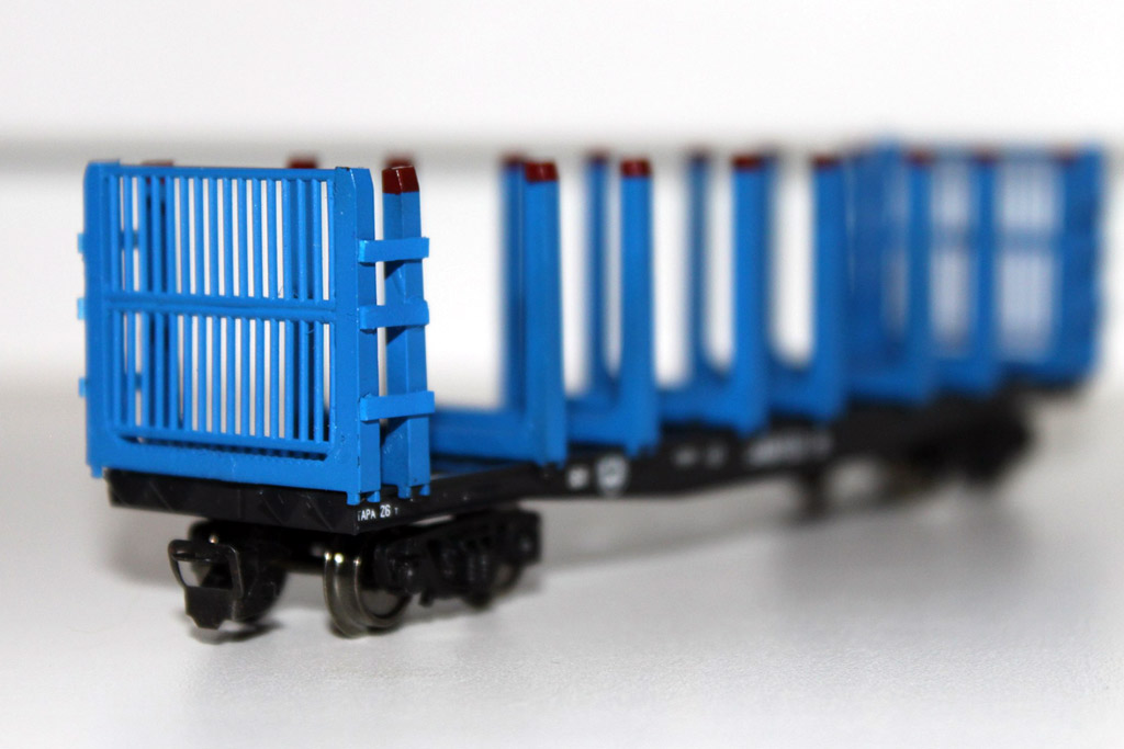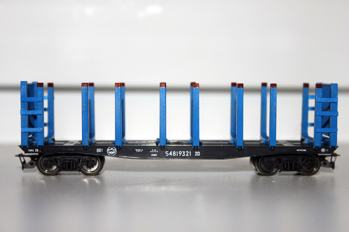 Разновидности: цветовые Эпоха: V Принадлежность: РЖД Фирма-производитель: Дерунов В. Год начала производства: 2013 Описание моделиПетербургским моделистом Владимиром Деруновым на основе серийной модели лесовозной плафтормы от фирмы "Пересвет" выполнена конверсия, соответствующая прототипу с торцевыми решётками. Известно 2 экземпляра модели, различающихся окраской; одна из них находится в коллекции петербургского моделиста К.Виноградова. Описание прототипаЛесовозная платформа с торцевыми решётками мод. 13-401-24 - продукт модернизации обычной 4-осной платформы мод. 13-401. Разработчик - ОАО "НВЦ "Вагоны". Производится серийно с 2003 г. на ОАО "Желдорстрой" и ОАО "Стахановский вагонзавод". Грузоподъямность - 66 или 67 т. в зависимости от модификации.