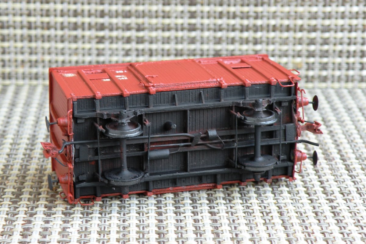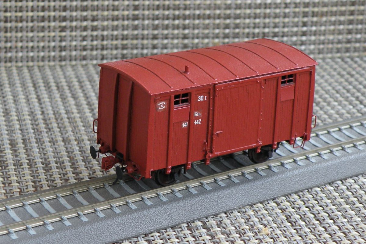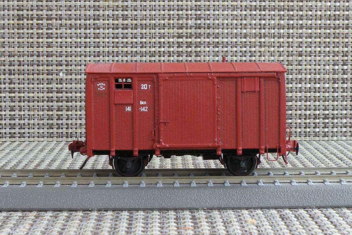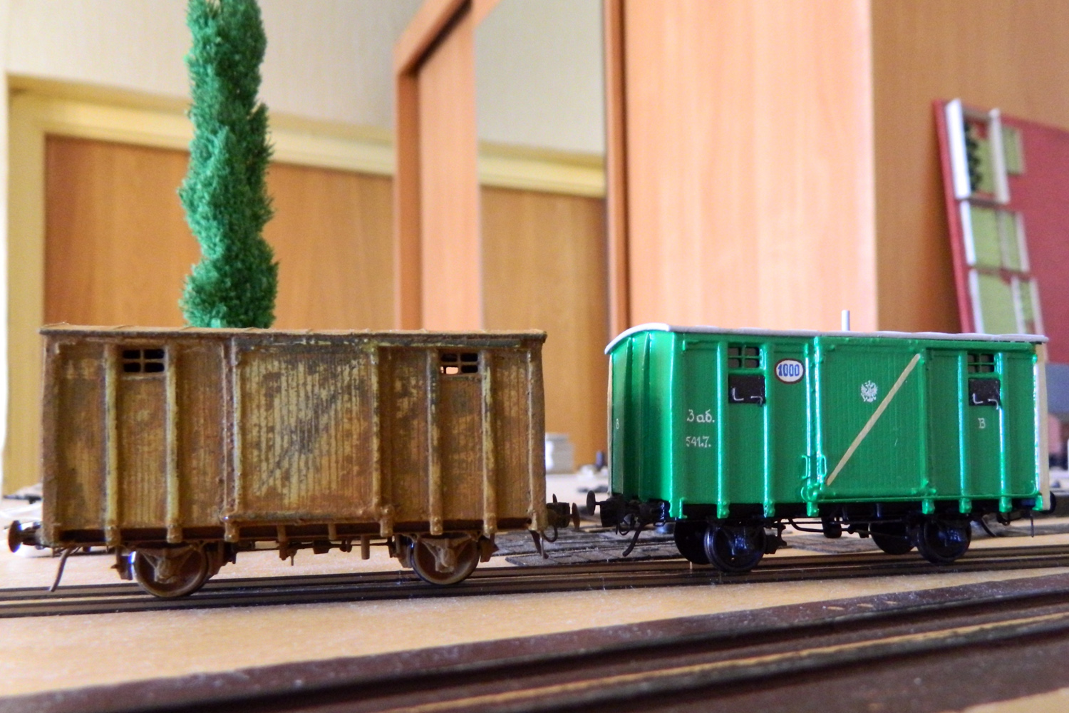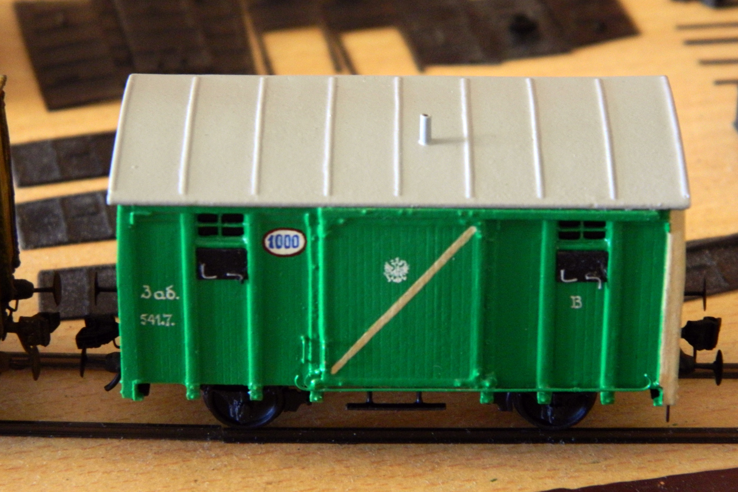 Разновидности: цвет, номер, эпоха, открытые/закрытые двери, наличие/отсутствие интерьера, конструктивные детали Эпоха: I-III Фирма-производитель: Михайлов А. Описание моделиМодель 2-осного крытого "нормального товарного вагона" (НТВ) "Сибирского типа" - работа московского моделиста Александра Михайлова. Модель нетормозного вагона в "состаренном" виде и без надписей впервые экспонировалась на выставке "Железнодорожная модель" в ЦМЖТ, Санкт-Петербург, в марте 2015 г. Известны также модели в составе военно-санитарного поезда 30-х гг., в зелёной окраске и др. Модели выпускаются в двух принципиально различных вариантах: с глухим кузовом и со сдвижными дверями. Модели находятся в частных коллекциях. Все детали модели, в том числе динамические буфера, изготовлены автором самостоятельно. Основной материал - эпоксидная смола. Другие модели крытых вагонов НТВ: - от А.Мурашова - от М.Кечетова. Описание прототипаВ 1889 г. в России было введено бесперегрузочное сообщение грузовых вагонов, обращающихся по разным железным дорогам. Это привело к необходимости нормализовать парк грузовых вагонов по типу конструкций и размерам. (До этого на каждой дороге строились вагоны по своим проектам, а более половины вагонного парка составляли вагоны постройки немецких, французских, английских и австрийских заводов. Такое разнообразие значительно усложняло их ремонт, так как необходимо было иметь очень большой перечень запасных частей). С 1892 г. крытые вагоны и платформы "нормального типа" были введены в законодательном порядке для всех государственных и частных железных дорог. 2-осные крытые вагоны НТВ "образца 1875 г." (вагоны правительственного заказа) массово выпускались отечественными заводами и были наиболее распространённым типом крытого вагона вплоть до 30-х гг. прошлого века. В советское время они подвергались реконструкции (установка хребтовой балки под автосцепки, укрепление несущих конструкций кузова). НТВ "Сибирского типа" отличался от "классического" НТВ увеличинной шириной, иным расположением досок в деревянной обшивке и некоторыми другими деталями.