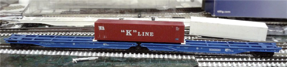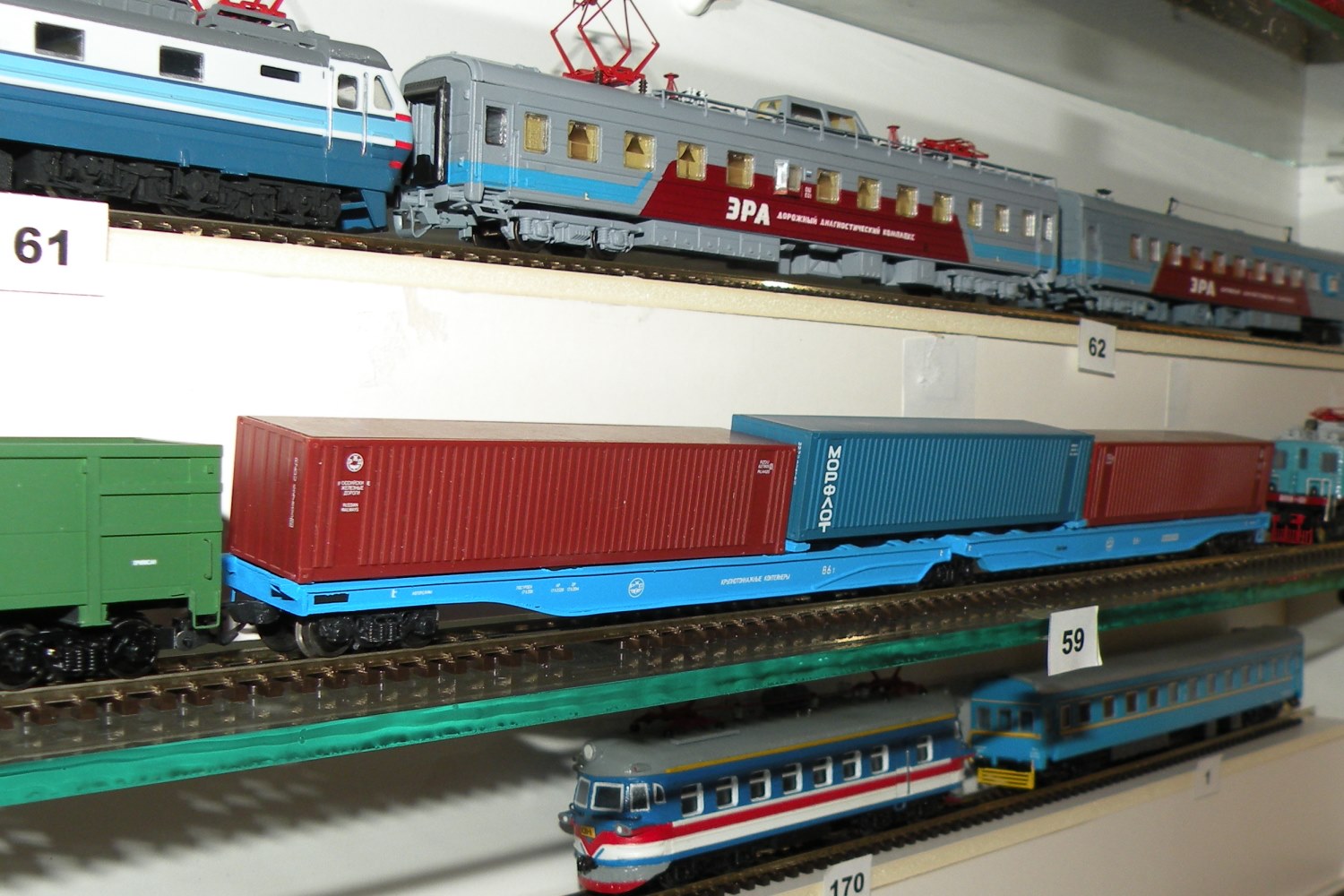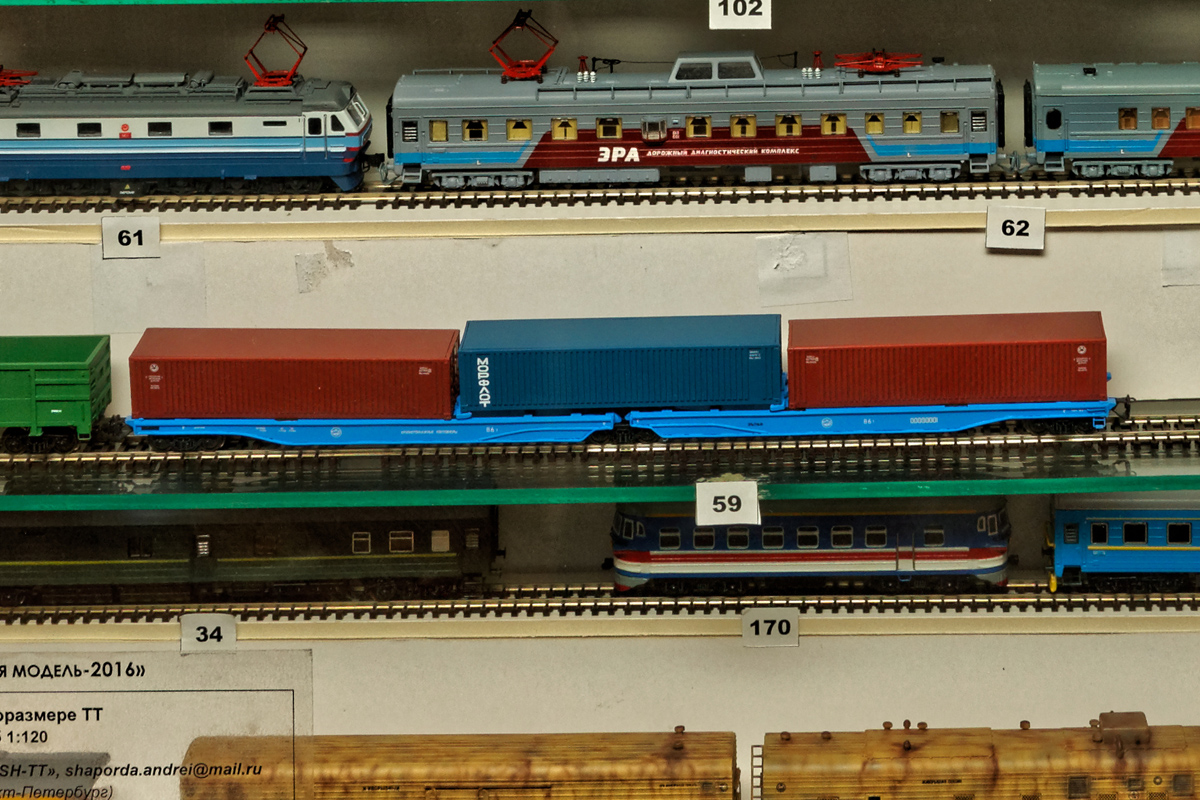 Эпоха: V Принадлежность: РЖД Фирма-производитель: Гладков В. Год начала производства: 2014 Описание моделиМодель сочленённой контейнерной платформы - авторская работа московского моделиста Василия Гладкова. Материал корпуса - полистирол. Использованы отдельные серийные детали производства фирмы "Пересвет" (тележки, сцепные устройства,тормозное оборудование). Описание прототипаСовременная платформа 13-470-01 для перевозки крупнотоннажных контейнеров представляет собой шестиосный вагон сочлененного типа. Изготавливается из двух платформ модели 13-470 с истекшим сроком службы. За счет оборудования устройством сочленения SAC-1, нестандартной конструкцией скользунов, поворотными турникетными опорами, вагон позволят перевозить три 40-футовых контейнера, один из которых установлен на турникетных опорах и перевозка которого производится над средней тележкой. Основные параметры: - погрузочная длина - 120 футов, - максимальная грузоподъёмность - 86,5 т, - габарит 1-Т, - срок службы - 32 года. Производитель: РМ Рейл (корпорация "Русские машины").
