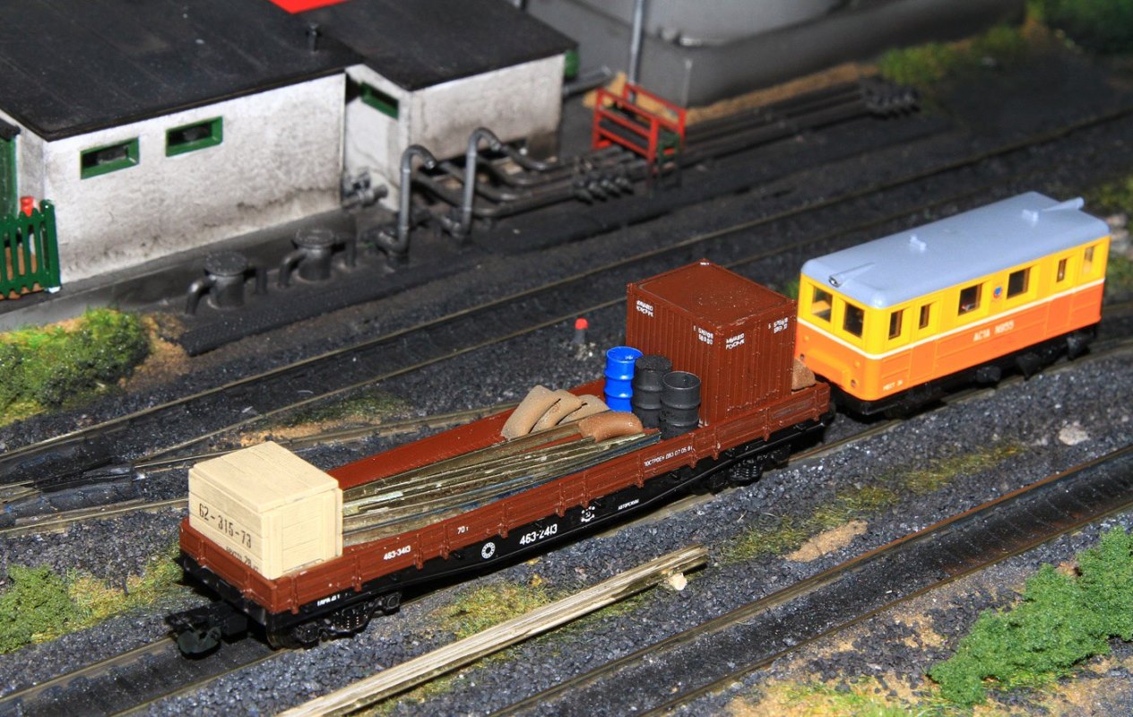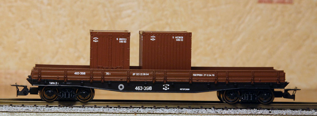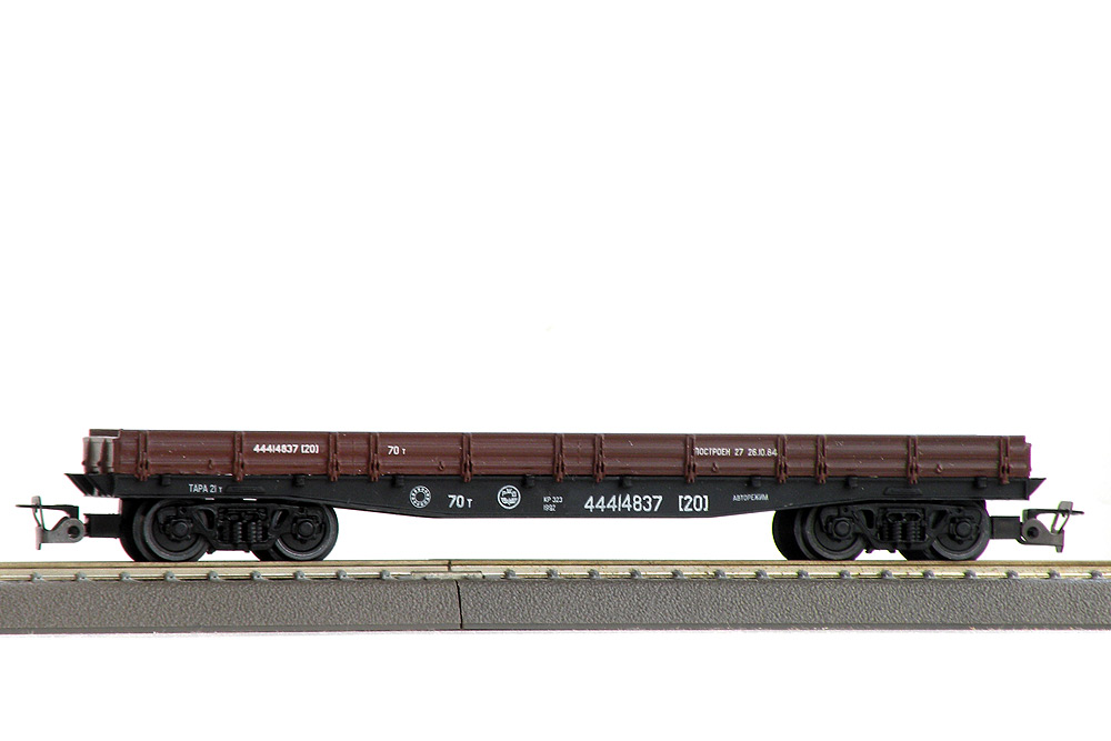Разновидности: принадлежность, цвет (коричневая и зеленая), номер, эпоха Эпоха: IV-V Принадлежность: СЖД, РЖД, пром. Фирма-производитель: Пересвет Год начала производства: 2010 Год окончания производства: производится до настоящего времени Артикул: 3650, 3651, 3652, 3653, 3654 Описание моделиМодель 4-осной универсальной бортовой платформы с металлическим бортами и деревометаллическим настилом производится фирмой "Пересвет" 2010 г. Серийная технология, пластик, тележки ЦНИИ-Х3О. Первой в конце 2010 г. появилась платформа с надписями IV эпохи (арт. 3650), с марта 2011 г. выпускается также платформа V эпохи (арт. 3651), во второй половине 2011 г. появилась платформа в зелёной окраске, принадлежащая промышленному предприятию "Ижорский завод" (арт.3652). С 2012 г. доступна ещё одна разновидность платформы IV эпохи СЖД с другим номером и грузом из двух среднетоннажных контейнеров (арт. 3653). На 2014 г. заявлено производство платформы в корпоративной серо-красной окраске РЖД (арт. 3654).